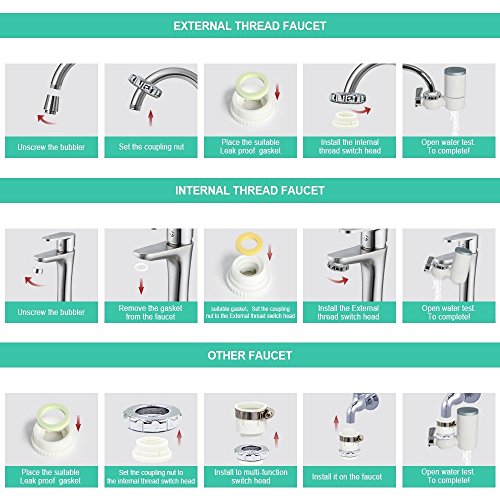 Studio : wewal Publisher : wewal Binding : Kitchen Product Description Faucet water filter, the accuracy of filtration is up to 0.1 um . Do not use electricity. Repeatedly washable combining diatom and ceramics NT hollow filter element, food grade ABS plastic material fuselage, harmless and durable. Product Parameters: Water Pressure: 0.1-0.5Mpa Operating Temperature: 5-38°C Rated Total Net Water: 260 gal Applicable Water Source and Applicable Minimum Dynamic Water pressure: Municipal Tap Water and 70kpa. Package Include: 1*Host 1*Filter element (inside the host) 1*Universal joints 6* Different sizes of internal and external thread faucet accessories 1*Manual 1*Sandpaper 1*Tighten the key 1*Certificate 4*Faucet accessories ring (3 separate placement, one in multi-purpose connector) Note: 1. Do not let the warm water over the temperature 35°C pass through the purified water side. 2. Do not let the hot water over the temperature 50°C pass through the raw water side. 3. If the purifier water n to be stored, please store it in the refrigerator. Use it ASAP. 4. Open the water for 3-5 sec every day before using the facet. If the faucet has not been used for over one week, please open the water for 10sec and clean water outlet. 5. Do not raise fish in purifier water. 6. When the filter water is smaller, the filter element needs to be cleaned, use sandpaper or dishcloth to clean the filter element, please gently wipe. 7. Replace the filter regularly, filter replacement cycle is recommended for 3-6 months, according to different water quality. 8. The following faucet that can't be installed: The length of the bay is below 15 mm; The length of the bay is above 25 mm; The bubble cover outside 22 mm; Square outlet and oval outlet; Please read the instructions carefully before installing and use the product and keep it for future reference. 0 |