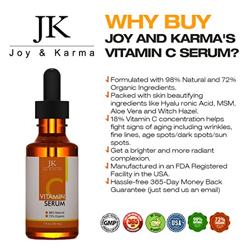 - Feature : 4.7 / 5.0 AVERAGE RATING ... We love our customers and our customers love us! Vitamin C Serum by Joy and Karma is currently one of the highest rated topical vitamin C anti aging facial serums on all of Amazon in April of 2015! / EFFECTIVE, SAFE, CRUELTY-FREE ... Joy and Karma is proud to have all our serums manufactured and bottled in a FDA approved facility right here in the USA. Joy and Karma does not and will not test on animals and is proud to be a cruelty-free operation. / BEAUTIFUL SKIN IS YOURS WITH OUR ORGANIC FORMULATION ... With over 72% organic ingredients, this liquid formulation does NOT contain nasty ingredients like parabens, petrochemicals, phthaltes and sulfates often found in creams and other skincare products. Scroll down for a full list of ingredients. / BEAUTIFUL YOU = BETTER WORLD ... Joy and Karma is here to spread good KARMA! When you buy a bottle of J&K, you're helping make the world a better place because Joy and Karma promises to donate 10% of profits in our first two years of operation. / THE JOY AND KARMA PROMISE ... We want our customers to buy with complete confidence and that is why we offer a 100% unconditional money back guarantee on all our products. If within the first 365 days of purchase, you're not satisfied in any way, just email us for a full refund. Our customers' happiness really means the world to us and we simply don't want your money unless you feel true JOY from using Joy and Karma products. :-)