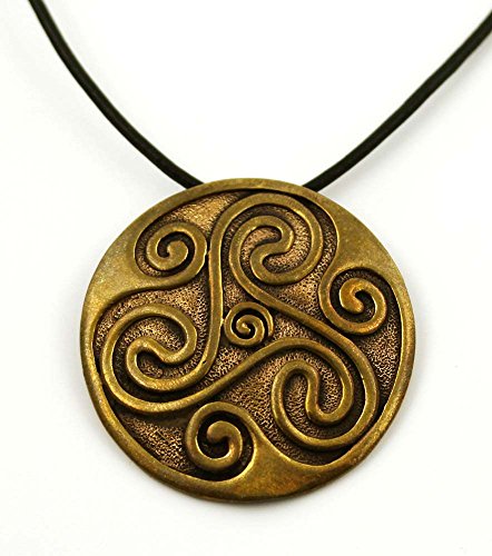 -. Feature : Bronze pendant necklace with Celtic Knot Triskelion Engraved Design, gold tone colored. / Extensible slide knot genuine leather cord length 18 - 32 inches in black color. / Good quality Bronze. Lead, cadmium and nickel free. / Approx. 4.50 cm (1.77 Inch) in Diameter / Imported, Thailand origin. Free Shipping !