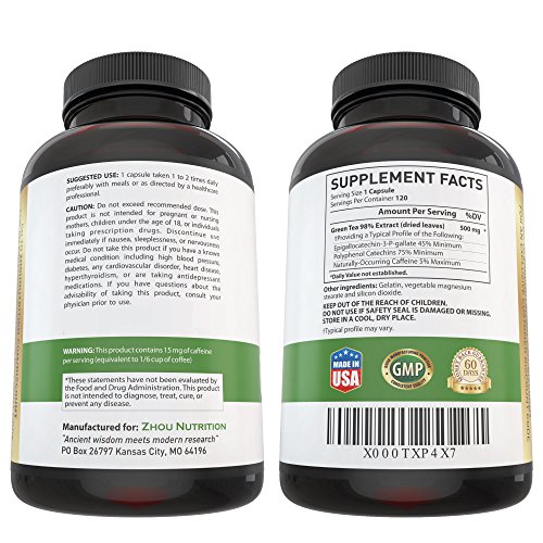 -. Feature : NATURALLY PROMOTE WEIGHT LOSS - Let's face it, nothing will melt pounds off of you. However, nature has provided us with ways to gently boost our metabolisms and get us moving! Green tea has been used for centuries in Asian cultures to promote healthy weight loss (and overall health), and has finally gained popularity in the Western world. Today, millions of people around the world incorporate Green Tea into their healthy lifestyles. / SUPER ANTIOXIDANT & FREE RADICAL SCAVENGER - Support your immune system! Zhou Nutrition's Green Tea Extract contains polyphenol catechins and Epigallocatechin gallate (EGCG) that fight cell damage and aid the growth of healthy cells in your body. / BOOST BRAIN FUNCTION - The combination of caffeine and L-theanine in Green Tea has synergistic effects to improve brain function, including improved mood, vigilance, reaction time and memory. Who couldn't benefit from a boost in brain function? / GENTLE ALL-DAY ENERGY - No jitters! Many have described the energy from Green Tea as "stable" and "steady." You'll get gentle energy that lasts throughout the day without the jitters and crash that high-caffeine products and supplements will have. You'll be surprised at how productive you can be. / OUR 100% MONEY-BACK GUARANTEE- As with all of our products, we offer a 60-DAY 100% Money Back Guarantee - return even the empty bottles! We're so confident that you'll love our Green Tea Extract that we will refund every penny if you aren't completely satisfied. Simply contact Zhou Nutrition directly for a full refund. What do you have to lose?