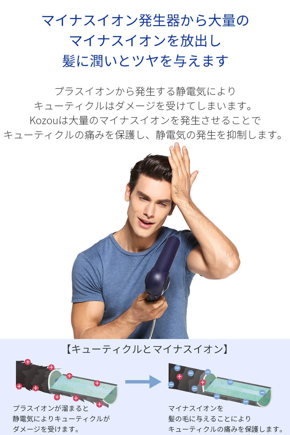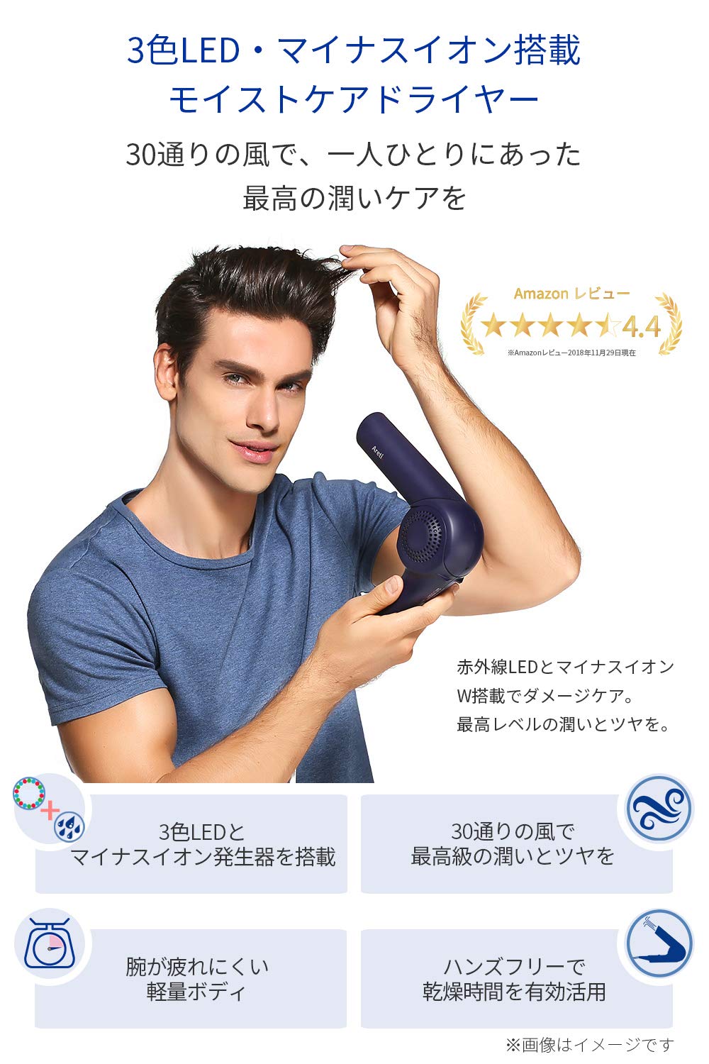 ●3色LEDとマイナスイオンを搭載した、【Areti アレティ】モイストケアドライヤー Kozou。日本人の繊細な髪質に寄り添った30通りの風を実現。お子様からご年配の方まで、髪の傷みを軽減してツヤと潤いを与えます。