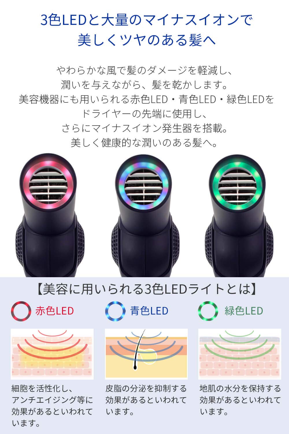 ●直感的に風量を調節できるダイヤル式インターフェース。手元のボタン1つで、かんたんにモード切り替え。3色のLEDライトが、風の効果を分かりやすく伝えます(青:マイナスイオン、赤:赤外線、緑:冷風)。