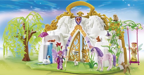 -. Feature : Embark on a fairytale adventure with the Take Along Unicorn Fairy Land / Portable case is perfect for travel and storing all the pieces it comes with / Adorned with sparkling jewels, the fairies love taking turns on the fairy swing / Open the back green panel and snap it into the front to create a luscious garden / Includes two winged fairies, one unicorn, swing, tree, flowers, owl, swan, fawn, rabbits, birds, and other accessories