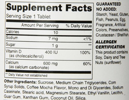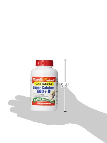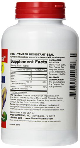 -. Binding : Health and Beauty -. Brand : Mason Vitamins -. Feature : Calcium builds strong bones and may helps prevent osteoporosis / Vitamin D improves Calcium absorption / Some people don't like or can't swallow tablets/capsules. This easy to chew Calcium+D is the answer that they are looking for / Delicious Coffee Mocha Flavor / Bone Health, Colon Health and Teeth Health -. IsAdultProduct : 0 -. Label : Mason Vitamins -. Manufacturer : Mason Vitamins -. MPN : 1403-100 -. NumberOfItems : 2 -. PackageQuantity : 2 -. PartNumber : 1403-100 -. ProductGroup : Health and Beauty -. ProductTypeName : HEALTH_PERSONAL_CARE -. PublicationDate : 2010-08-30 -. Publisher : Mason Vitamins -. Studio : Mason Vitamins -. Title : Mason Vitamins Chewable Calcium 600 with Vitamins D3, A Tasty Coffee Mocha Flavor, 100-Count, (Pack of 2)