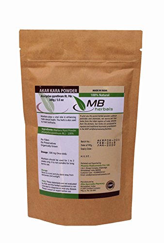 -. Binding : Health and Beauty -. Brand : MB Herbals -. Color : Pale Green -. Feature : 100% Pure Akarkara Root Powder ---- No Preservatives. No Fillers / Additives. No Corn Flour. No Yeast. No Gluten or Starch. / Parts Used: Roots of Anacyclus pyrethrum (Akarkara) / Mfg Date: June 2017 ---- Expiry Date: May 2019 / Processed by FDA Registered and GMP Certified Facility. / SATISFACTION GUARANTEE - We are passionate about our products and put the highest emphasis on quality. We are confident that you will love our products. For any reason, if you are not happy with the purchase, just send us a message and we will refund your full payment without any conditions or returns -. IsAdultProduct : 0 -. Label : MB Herbals -. Manufacturer : MB Herbals -. MPN : Akarkara Powder -. PackageQuantity : 1 -. PartNumber : Akarkara Powder -. ProductGroup : Health and Beauty -. ProductTypeName : HEALTH_PERSONAL_CARE -. Publisher : MB Herbals -. Studio : MB Herbals -. Title : MB Herbals Pure Anacyclus pyrethrum Root Powder 100g / 3.5 oz - Akarkara / Akar Kara / Pellitory / Longwort Root Powder / Spanish Chamomile Root Powder