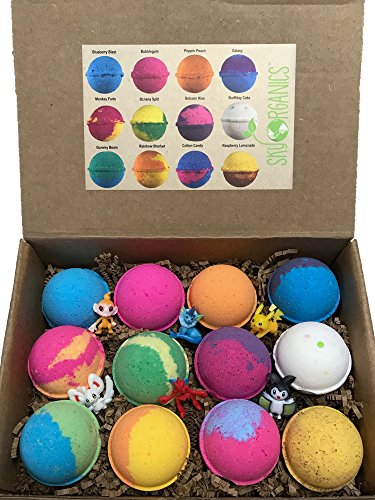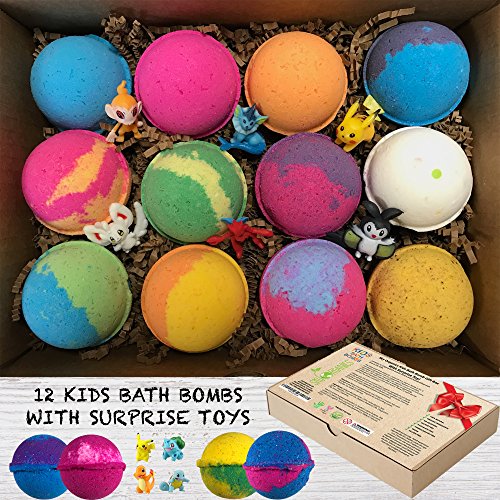 SUPER FUN GIFT SET OF 12 KIDS BATH BOMBS WITH TOY – this set contains 12 (twelve) Large bath bombs of 3.2 oz each. They contain a gender neutral surprise toy that are loose in the box! (Pokemon at the moment)