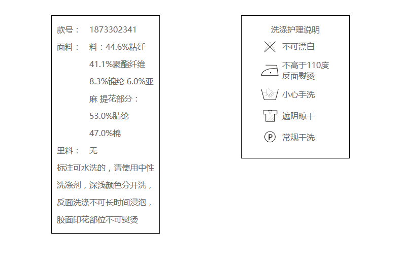 料:44.6%粘纤 41.1%聚酯纤维 8.3%锦纶 6.0%亚麻 提花部分:53.0%腈纶 47.0%棉