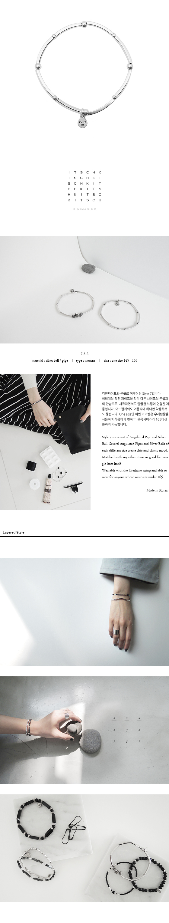 - 주문시 유의사항 : 베리송크(varisonc) 제품으로만 50,000원 이상 구매시 배송비 무료 (배송비 3,000원/도서산간지역 도선료 추가) 줄자, 종이, 끈 등을 활용하여 팔목 사이즈 측정해보시고, 팔목 사이즈보다 약 5mm 크게 팔찌 사이즈를 선택해주세요. 각진파이프와 은볼로 이루어진 Style 7입니다. 여러개의 각진 파이프와 각기 다른 사이즈의 은볼과의 만남으로 시크하면서도 깔끔한 느낌이 연출된 제품입니다. 어느팔찌와도 어울리며 하나만 착용하셔도 좋습니다.