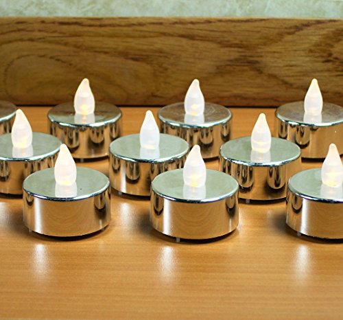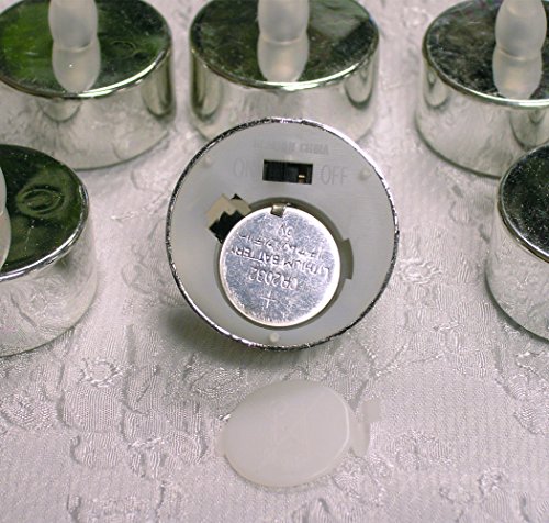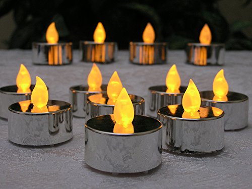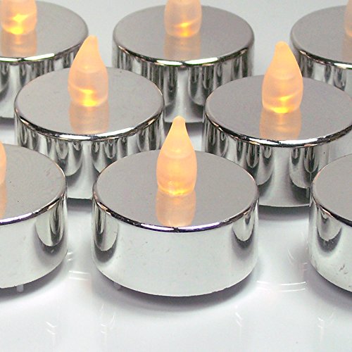 SILVER FLAME FREE TEALIGHT CANDLES. 12 metallic silver flameless tealights. 1 dozen tea lights are the perfect addition to any event. Use them in TABLE CENTERPIECES for a dramatic effect. Add them to your silver wedding decorations, graduation decorations, over the hill parties, 25the wedding anniversary parties, bridal showers, baby showers, promotional events, restaurant decor, tea light candle holders and holiday parties.