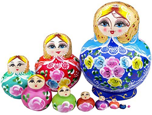 Studio : Winterworm Publisher : Winterworm Binding : Toy Product Description Introduction: Nesting doll, or Matryoshka, is a set of traditional Russian dolls, making its debut in the late 19th century in Russia. The name has somewhat gained around the world and become a notable must-have souvenir from Russia. The doll set consists of multiple separate ones that smaller one is put inside a larger hollower one. The structure is simple yet intriguing as when you seem to constantly discovery little ones inside. It is an engaging experience. Specification: Material: Basswood. Pattern: The dolls are in bellied shape, ten layers in total.All dolls are coated with handmade painting. For the biggest one, it has the most detailed illustration in all ten dolls. From top down, the head part is traditional tinted blonde grinning russian girl with rosy cheek. The rest part is split into half sky blue, half dark blue, yellow, red and blue flowers all around, and green leaves. Down to the ground base, the gilted golden rings flow around, coordinated with the general Russian motif. The remaining dolls share similar patterns, and have all differn colors, such as pink, red, green, yellow. Size: Largest: H x D(diameter)= 15 x 10 cm/5.9" x 3.9" Smallest: H x D= 1x 1.2 cm/0.4" x 0.5" Package include: 10 x Nesting dolls Note: Choking hazard! Not recommend for kids under 3, because it contains small and tiny parts. Painting on each doll is different from the rest due to its handmade quality. Also, the inside small ones are in random colors, for your reference.