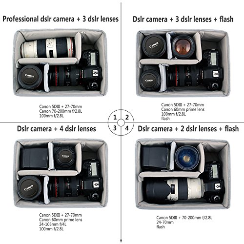 Ample interior storage offers versatile storage compartments that allows you to place your camera, lens, adapters and other accessories. It can hold: professional DSLR+3DSLR Lenses or DSLR camra+3 DSLR Lenses+ flash or DSLR Camera+4DSLR Lenses or DSLR camera+2 DSLR lenses+ flash