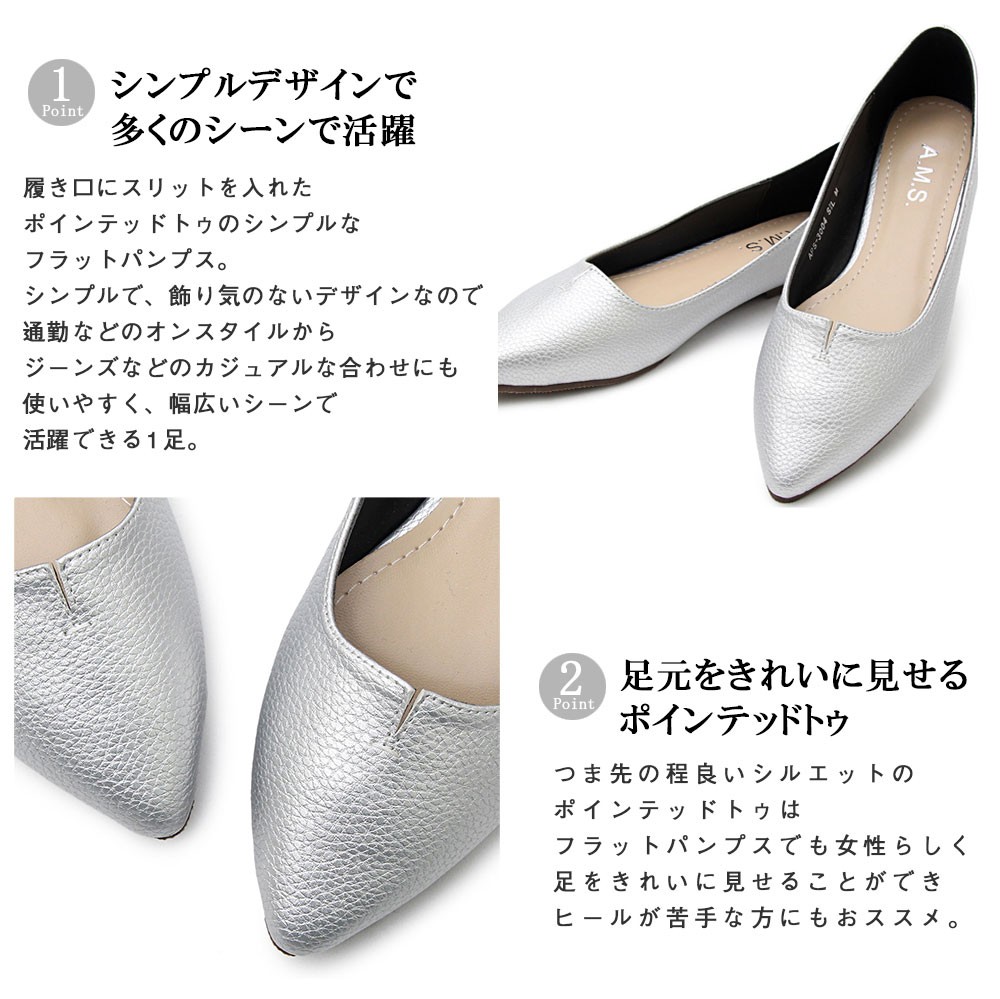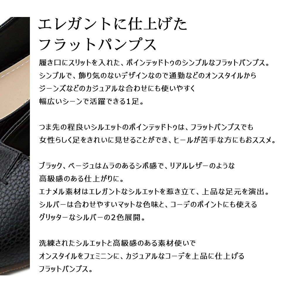 | 商品説明 | "エレガントに仕上げたフラットパンプス" 履き口にスリットを入れた、ポインテッドトゥのシンプルなフラットパンプス。 シンプルで、飾り気のないデザインなので通勤などのオンスタイルから、 ジーンズなどのカジュアルな合わせにも使いやすく、幅広いシーンで活躍できる1足。 つま先の程良いシルエットのポインテッドトゥは、 フラットパンプスでも女性らしく足をきれいに見せることができ、ヒールが苦手な方にもおススメ。 ブラック、ベージュ、シルバーはムラのあるシボ感がリアルレザーのような高級感のある仕上がりに。 エナメル素材はエレガントなシルエットを惹き立て、上品な足元を演出。 洗練されたシルエットと高級感のある素材使いで、 オンスタイルをフェミニンに、カジュアルなコーデを上品に仕上げるフラットパンプス。 |