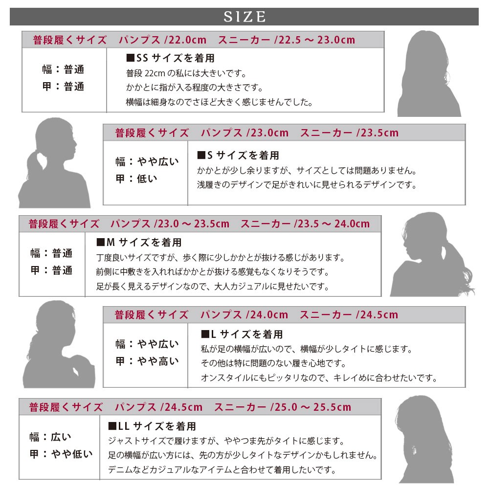 | サイズ(約:cm) | SS(22.5cm-23.0cm) S (23.0cm-23.5cm) M (23.5cm-24.0cm) L (24.0cm-24.5cm) LL(24.5cm-25.0cm) |
