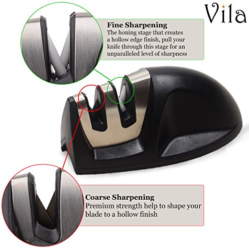 TWO-STAGE SHARPENING SLOTS--- The Vila Knife Sharpener has2 slots - Coarse and Fine. The coarse slot polishes dull or damaged knives. Fine, the second slot, has ceramic rods for quick touch ups and for finishing your knife to a razor sharpness.