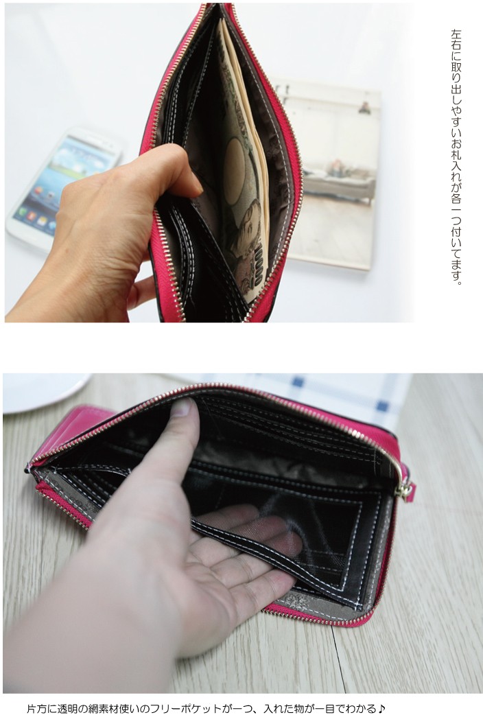 左右に取り出しやすいお札入れが各一つ付いてます。 真ん中に小銭をドサッと入れて、お札も、カードも、小銭も一度に出せるので、支払いがとっても楽ちん。 片方に透明の網素材使いのフリーポケットが一つ、入れた物が一目でわかる♪ 女性には嬉しいカードもたくさん入る実用的なお財布です。 サイズ (約cm) 縦11cm 横20.5cm マチ1.5cm 紙幣ポケット ×2 カードポケット ×12 ふりーポケット ×1 ※多少の誤差がある場合や表記サイズと異なる場合がござい ます。予めご了承くださいませ。 ラッピングの場合送料400円 北海道・沖縄の場合900円かかります。 |