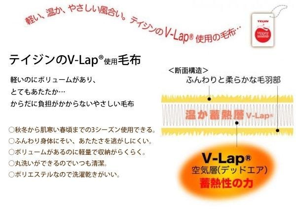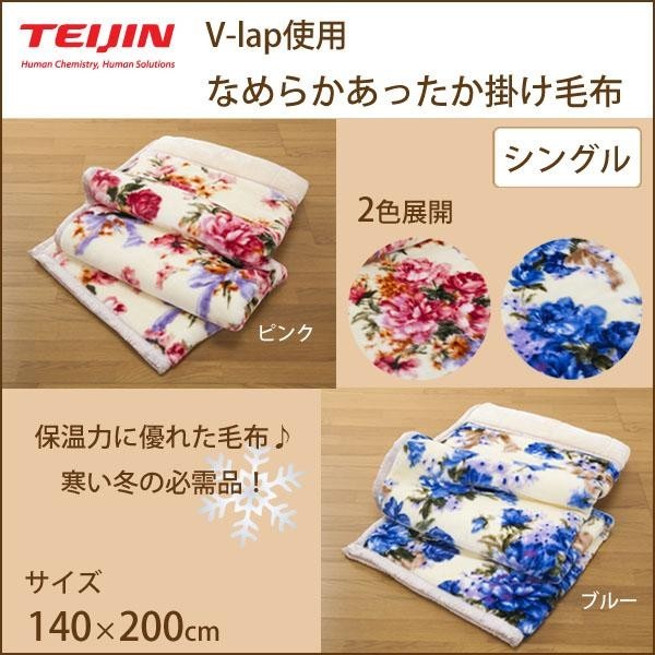 テイジンオリジナル素材のV-Lap(R)を使用した、あったか掛け毛布です。毛羽部の隙間の空気層が熱をにがしにくく、保温力に優れていますので、ふんわりやわらかな肌触りであたたかく、快適におやすみいただけます。また、ご家庭で手洗いが可能なので、汚れても手軽にお手入れができます。色彩ゆたかで美しいフラワー柄がベッドルームを華やかに演出します。 |