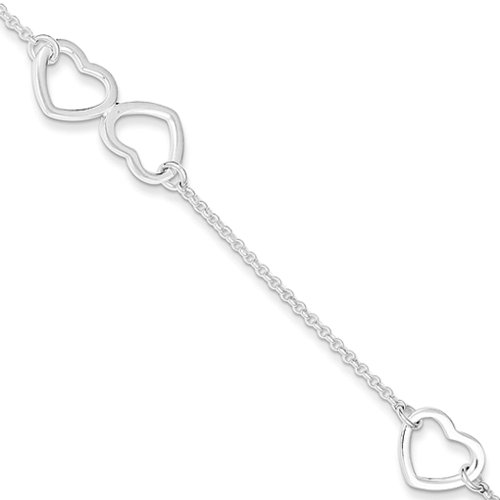 Make a summer fashion statement with this sterling silver bracelet that adds unexpected shimmer around your ankle. Polished 10 x 12mm open hearts connects a 1.5mm cable chain that measures 9 inches in length with a 1-inch extender and fancy lobster clasp.Feature