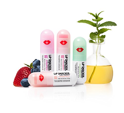 Lip Smacker Kiss Therapy 4-pack includes 3 flavored sunscreen SPF balms and 1 medicated lip balm. Sunscreen SPF 30 balms provide the ultimate lip protection and care through its dual formula system. The antioxidant core packed with Citrus Antioxidants protects lips against free radicals, while the outer formula locks in moisture with Coconut & Jojoba oils. Kiss Therapy Eucalyptus Mint Medicated Lip Balm provides dry, chapped lips the comfort, care and moisture they need to recover from exposure to extreme conditions. Coconut Oil & Shea Butter formula provides advance moisture with a no-shine finish.Feature