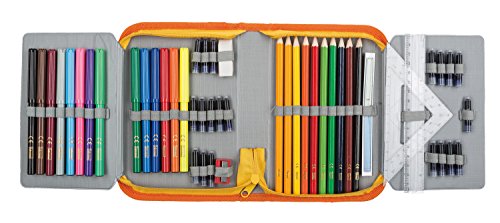 Inhalt: Buntstifte, Bleistifte, Fasermaler, Radierer, Spitzer, Patronen, Lineal und Geodreieck