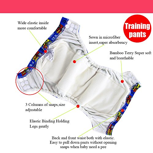 -. Feature : Material:Outer, 100% PUL;Inner, 100% bamboo,Lining:100% polyester - which will catch any solids / Waist: About 20cm-35cm(7.8"-13.8"),Training diapers can fit baby suitable weight: S(10-18lbs/4.5-8kg), M(18-30lbs/8-13.5kg), L(30-40lbs/13.5-18kg). / They have 3 rows of snaps on each side, allowing you to fully adjust the diaper to any size setting. They also have 2 rows of snaps at the front, allowing you to adjust the height of the diaper and fit around the legs. / One size fits all: by adjusting the front corresponding snaps. Just perfect for saving your money in the long term.Training diaper suitable for baby to sleep at night time use. This allows the baby and the baby's mother to sleep peace of mind. The mother does not need to worry about the baby will wet the bed.