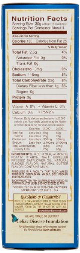 -. Feature : Contains 1 - 4.25 ounce box / Crunchy cracker made with almonds / 3 grams of protein per serving / No cholesterol and no saturated fat / Gluten-free, Certified Kosher