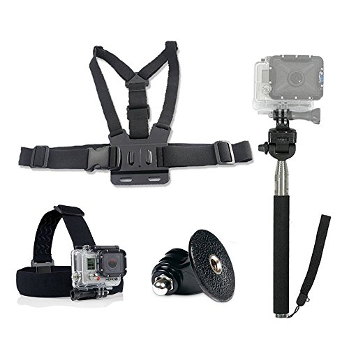 GoPro Accessories Kit (4 in 1) - Peyou Sport Camera Accessory Combo Kit for GoPro HD Hero 1 2 3 3+ 4 Elastic Adjustable Head Strap Mount + Chest Mount Harness + Replacement GoPro Tripod Mount + Extendable Self-portrait Monopod