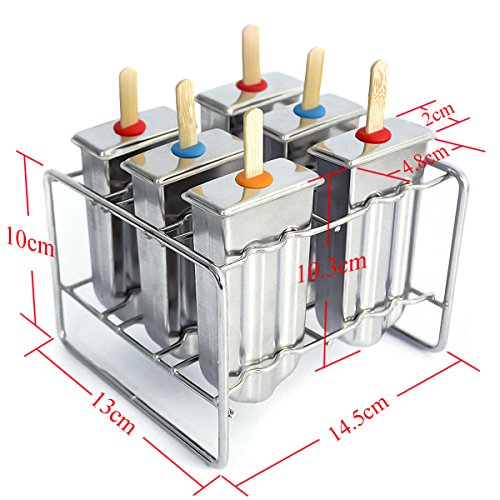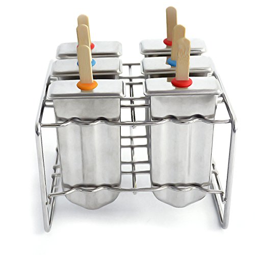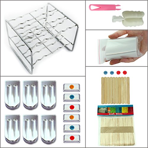 kingleder Stainless Steel Ice Lolly Popsicle Molds Kit - 6 Ice Pop Makers With Holder Base + 50 Reusable Bamboo Sticks + 16 Silicone Seals + 20 Pop Bags + Cleaning Brush