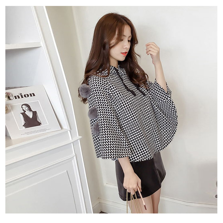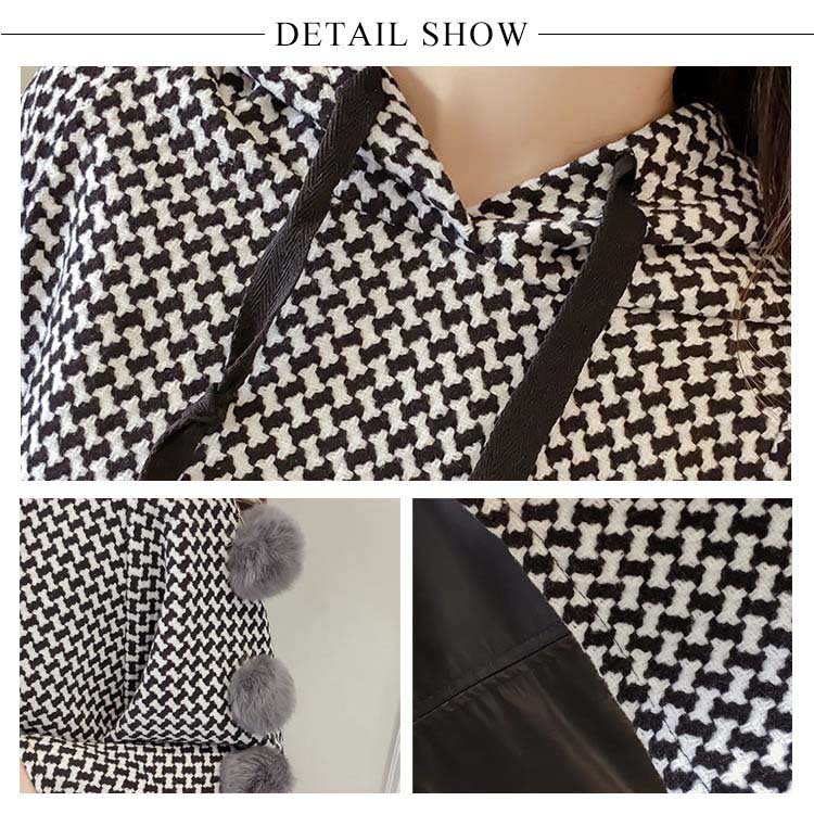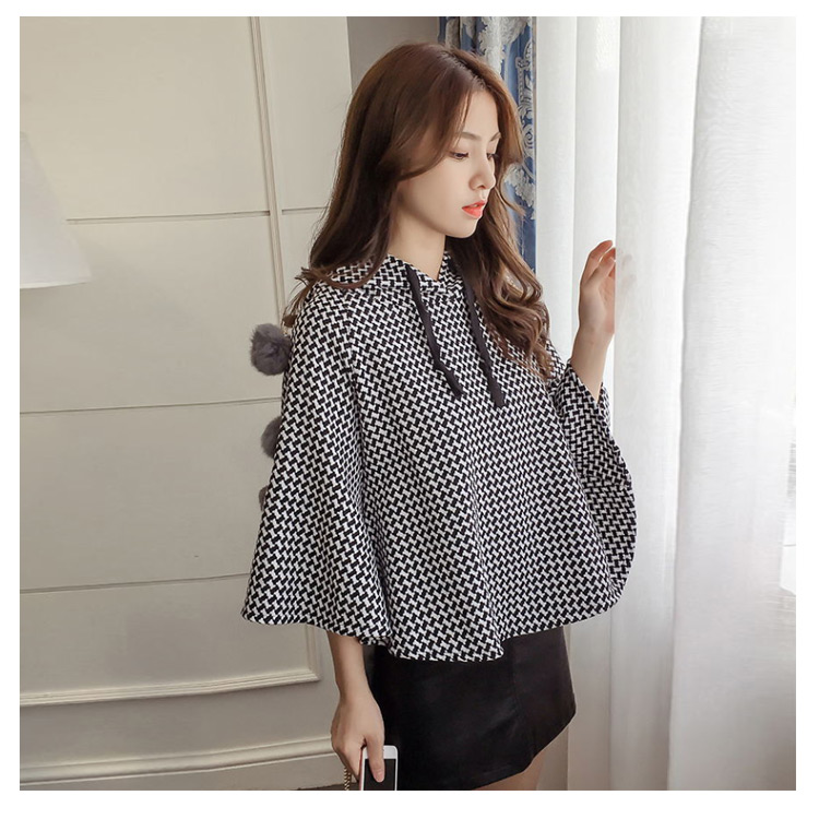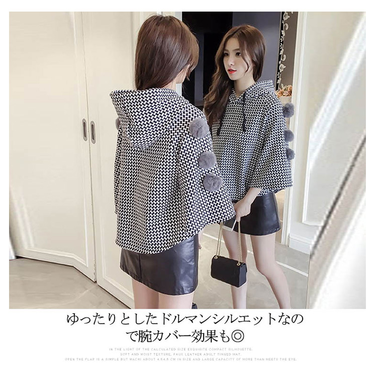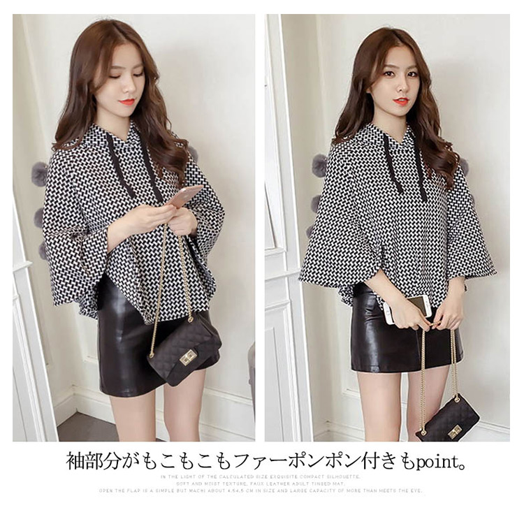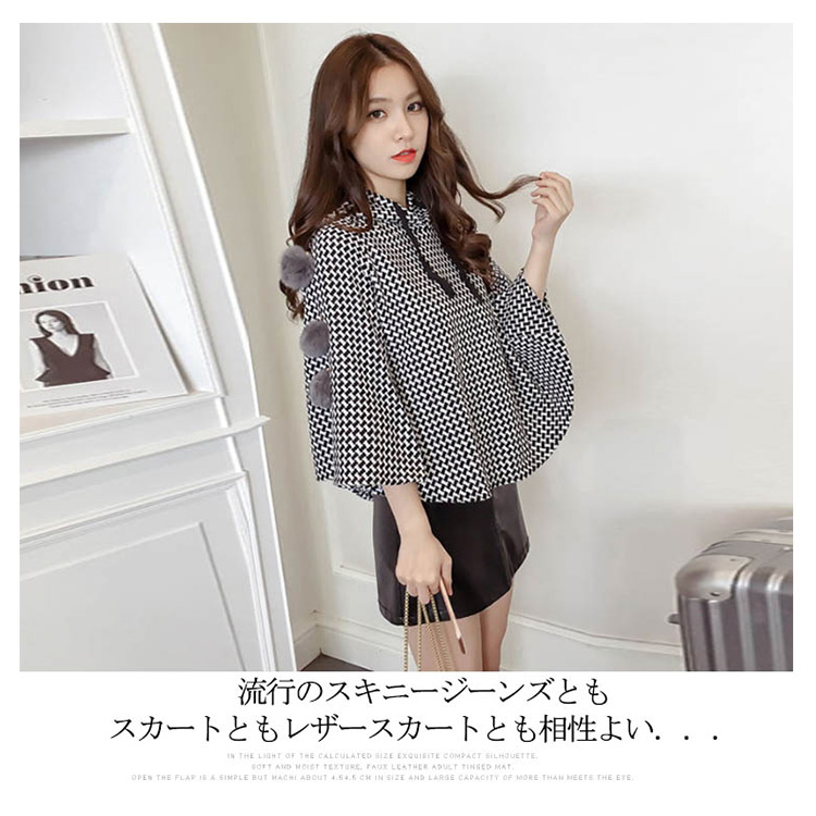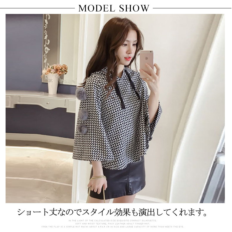 | 大カワイイ千鳥柄マントコート。ショート丈なのでスタイル効果も演出してくれます。袖部分がもこもこもファーポンポン付きもpoint。ゆったりとしたドルマンシルエットなので腕カバー効果も◎流行のスキニージーンズともスカートともレザースカートとも相性よい... | |