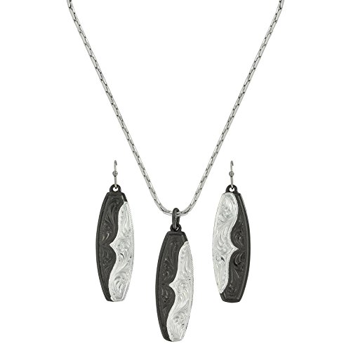 A two tone long oval of black nickel and silver finish with a yoke pattern set. Earrings hang on French hooks. Necklace on a 19 inch chain.