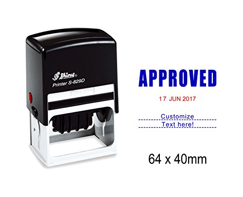 -. Binding : Office Product -. Brand : Shiny Ink Stamps -. Color : Black with Red Date -. Feature : Self Inking Shiny S-829D Date Stamper with text Approved and Customize Text Here as shown in the picture. / After placing the order please mail us the details for the custom text to be personalized on the stamp. Please keep a check on amazon emails just in case we need any further information. / Brand: Shiny Ink Stamps | Pre -inked for thousands of impressions, Re -inkable|Approximate Impression Area : 64mm x 40mm | Features a single -sided ink pad ; Stamp Production Time: 1-2 Business Days / Ink Colour: Black with Red Date / Your stamp will arrive with a beautiful P.R.Inttoo Pouch as shown in one of the image. -. Label : Shiny Ink Stamps -. Manufacturer : Shiny Ink Stamps -. MPN : SHINY-DT-55PAR -. PackageQuantity : 1 -. PartNumber : SHINY-DT-55PAR -. ProductGroup : Office Product -. ProductTypeName : OFFICE_PRODUCTS -. Publisher : Shiny Ink Stamps -. Studio : Shiny Ink Stamps -. Title : Self Inking Shiny Date Stamp With Approved & Customize Text Here Text Office Stationary Rubber Stamp S-829D