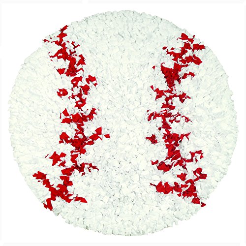 The fun shaggy raggy baseball children and nursery rug is 100% handmade. It measures a 3ft in diameter and creates a beautiful one of kind toy room or nursery area rug for the future athlete. The excellent craftsmanship and dedication give this rug a one of a kind look. No part of this rug is machine made or produced. The shaggy raggy look is accomplished by first dying each fabric with safe organic colorants to achieve proper color and texture. Next, they are woven together using cut strips of cotton jersey, wool and leather. Each strip is then tied one at a time by hand to achieve its realistic baseball look. No other rugs on the market can compare to the craftsmanship and quality of the shaggy raggy baseball area rug. Professional cleaning recommended.Feature