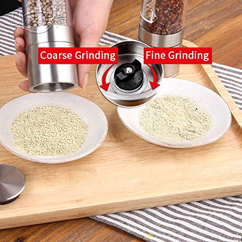 NICE QUALITY ENSURE YOUR HEALTH.Unlike any other cheap plastic pepper mill,our salt pepper mill set central body is made of BAP-Free,tough acrylic with beautiful STAINLESS-STEEL end caps for a look that ensure your health and works perfectly on your counter top or dining room table at the same time.