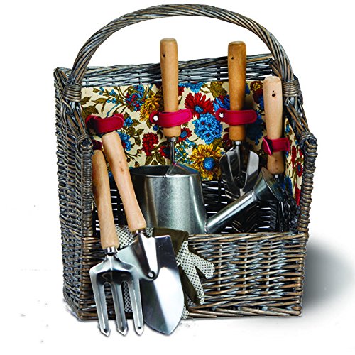 - With a classical antique finish, the Picnic Plus Countryside Garden Tool Basket makes a useful gift for both avid and novice gardeners. Featuring our exclusive April Cornell Floribunda pattern lining, this 8 piece set includes: hand trowel, cultivator, weeder, transplanter, hand hoe & fork, watering can, gardening gloves, and hand crafted willow basket.