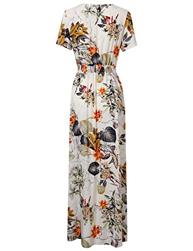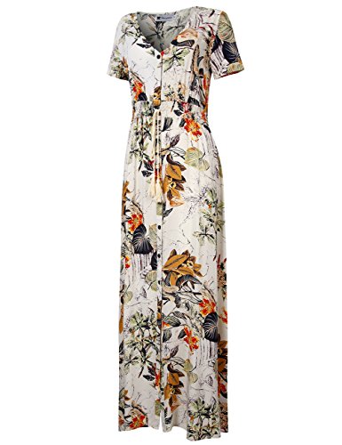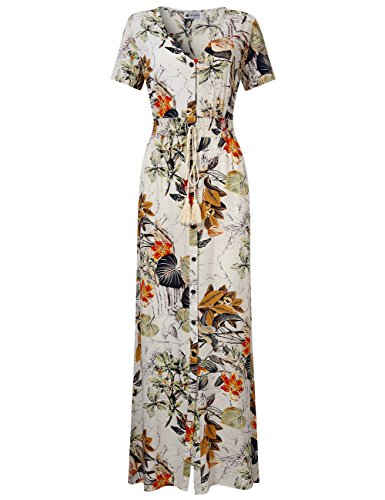 FEATURES: A Line, V-Neck, Short Sleeve, Vintage Floral Print, Buttons Up, Flowy Split Summer Long Dress