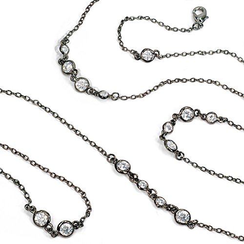 Long, airy, slinky 35" layering necklace. High quality cubic zirconia chaton stones are channel set along a delicate cable chain. One, two and three stone stations impart a casual, yet luxurious look. In any lighting, the quality of the czs give the illusion of a yard of diamonds. Wear it long or doubled. Layer it with our other chains or your diamond solitare. Choice of silvery rhodium or hematite finish.Feature