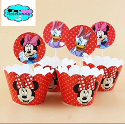Decolandy 12 Sets Minnie Mouse red and pink Cupcake wrappers and toppers, Minnie Mouse Red Cupcake decorations,Minnie Mouse and Daisy ,Minnie and Daisy decoration