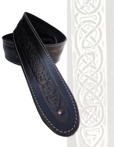 UK-Made Black Celtic Knot LEATHER Guitar Strap - Acoustic Bass + 6 Free Picks