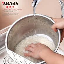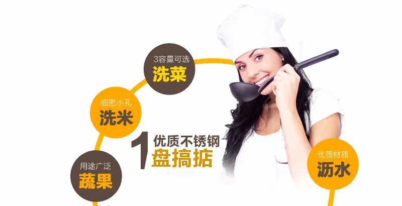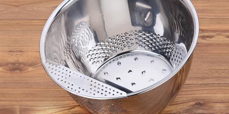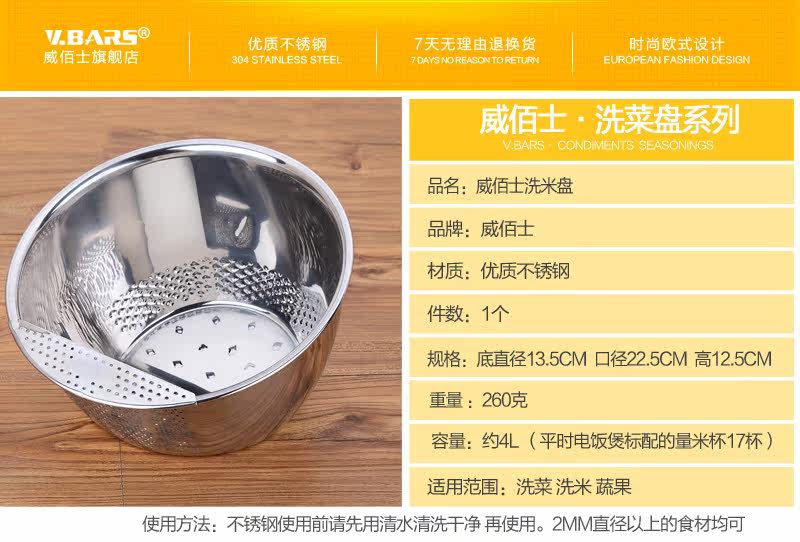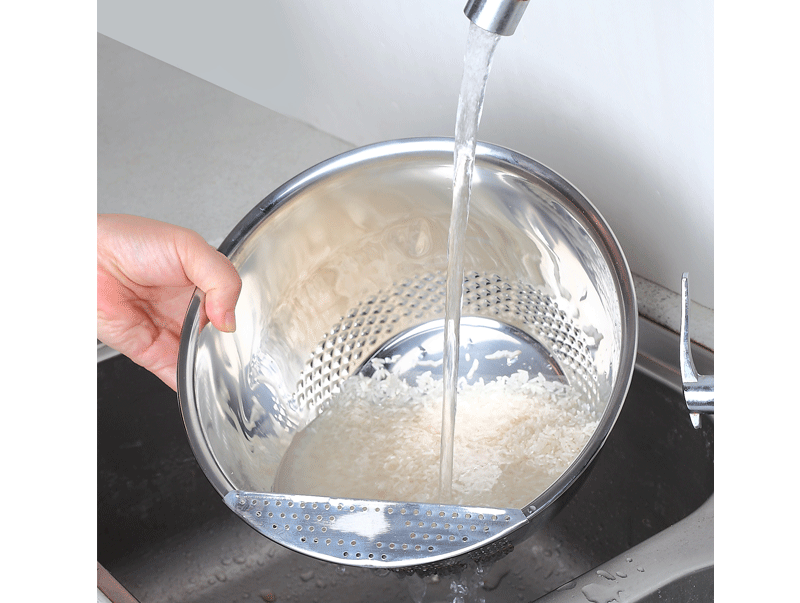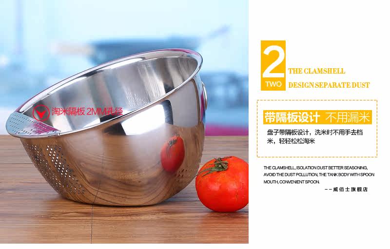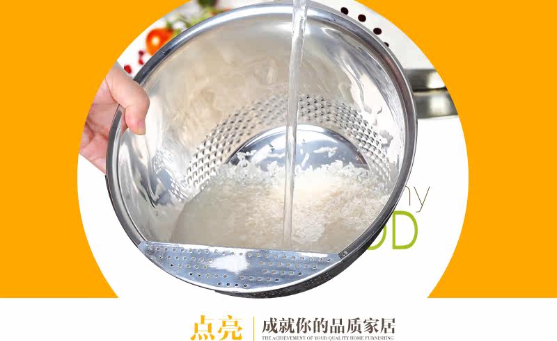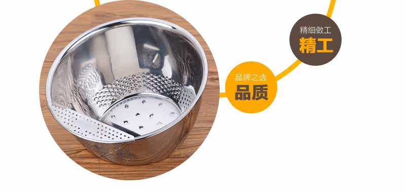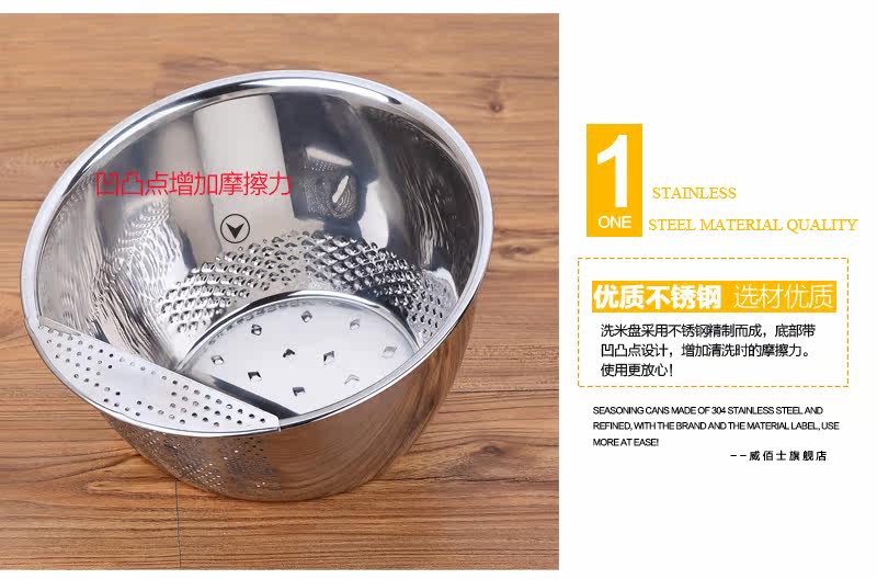 多功能设计,可洗米,面,菜,淘洗很方便,盆口有隔水栏,去水不用手隔方便简单,容器底部有凹凸处理,淘米时可增大摩擦力,洗涤效果明显
