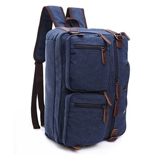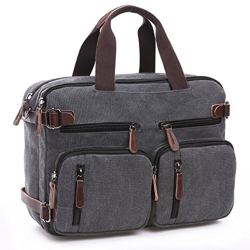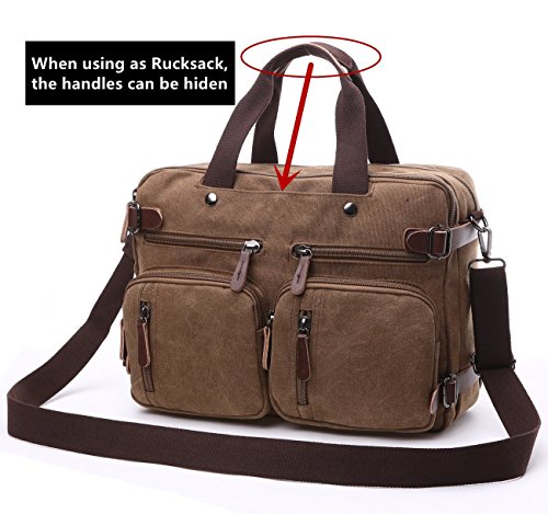 -. Feature : Top-quality, dense, durable canvas with a bit of PU leather straps which furthers the overall vintage-rustic look of this new backpack messenger bag / Size: 38.5 x 28.5 x 13 CM / 15.1 x 11.2 x 5.1inch , fits 14 Inch laptop easily / 3-in-1 Multi-Purpose: Briefcase Transforms ,Sleek and versatile design, the bag is convertible for use as briefcase, messenger bag, or backpack depending on need and carrying preference. / Extra Protection: Padded laptop compartment and interior to provide extra cushion for electronic accessories. Travel safe lockable zipper for protection against laptop theft. / Ergonomic Straps: Padded messenger and backpack straps for reduced body stress and comfort wear. Soft vegan leather padded handle grips and zipper pulls.