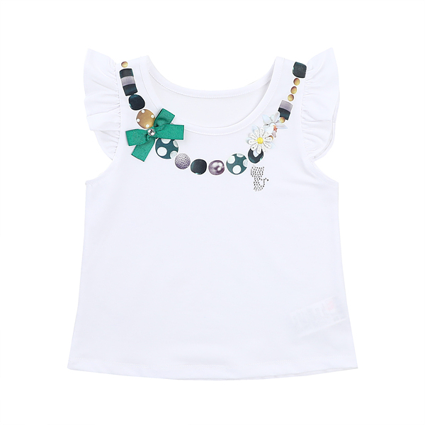 상품설명 화이트 컬러에 목걸이 전사나염이 찍혀있는 티셔츠 입니다. 전사 나염위에 리본과, 꽃모티브 장식이 큐트함을 더했습니다. 어떠한 하의와도 코디하시기 좋습니다.