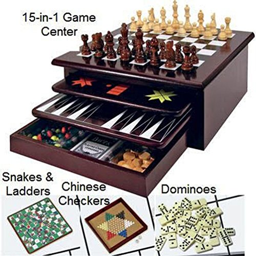 -. Title : Board Game Set - Deluxe 15 in 1 Tabletop Wood-accented Game Center with Storage Drawer (Checkers, Chess, Chinese Checkers, Parcheesi, TicTacToe, SOlitaire, Snakes and Ladders, Mancala, Backgammon, Poker Dice, Playing Cards, Go Fish, Old Maid, and Dominos)