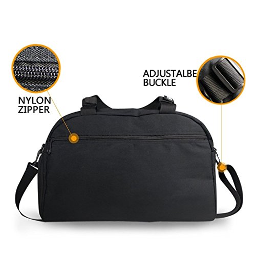 -. Feature : Approx Dimensions:17.7" L x 11.4" H x 8.2" W / Zippers on main compartment,adjustable strap and carry handls / Material:canvas,durable, stain resistant and no peculiar smell / Pockets:1 side zipper pocket for shoes;1 pocket on the back;3 interior pockets(convenient to store clothes,water bottle,cell phone,etc) / Easy to take away,perfect weekend bag,suitable for travel and sports