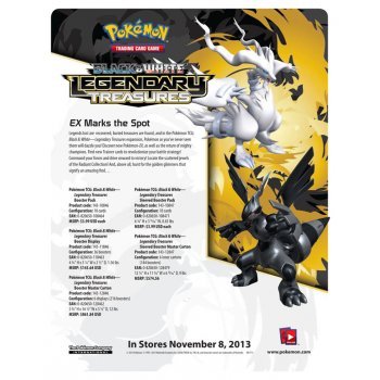 -. Binding : Toy -. Brand : Pok?mon -. EAN : 0820650118463 -. Feature : A box has 36 sealed packs / each pack has 10 cards. Look for 1 rare card per pack and 1-3 EX / foil cards per box on average. / Pokemon Black and White 11 will be LOADED with great cards. Cards that casual fans will love to collect. Cards that gamers will treasure to have in their decks. / Legends lost are recovered / buried treasures are found / and in the Pokemon TCG: Black & White-Legendary Treasures expansion / Pokemon as you've never seen / Command your forces and drive onward to victory! Locate the scattered jewels of the Radiant Collection! And / above all / hunt for the golden glimmers that signify an amazing find... / Discover new Pokemon-EX / as well as the return of mighty champions - find new Trainer cards to revolutionize your battle strategy! -. IsAdultProduct : 0 -. IsAutographed : 0 -. IsMemorabilia : 0 -. Label : Pokémon Co Intl -. LegalDisclaimer : inventory subject to change. -. Manufacturer : Pokémon Co Intl -. Model : 12521 -. PackageQuantity : 1 -. ProductGroup : Toy -. ProductTypeName : TOYS_AND_GAMES -. Publisher : Pokémon Co Intl -. Studio : Pokémon Co Intl -. Title : Pokémon Trading Card Game: Black & White Legendary Treasures Booster Display (36 Boosters) -. UPC : 820650118463