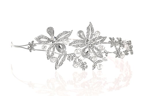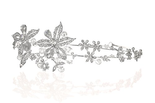 Made with clear rhinestone crystals in a silver plated metal setting. Measures approximately 2 inches at the highest point Beautiful design measures 9 inches along the band. Pin loops at each end of the tiara for extra security. Fantastic hair accessories for weddings_ proms_ parties or other special occasions.