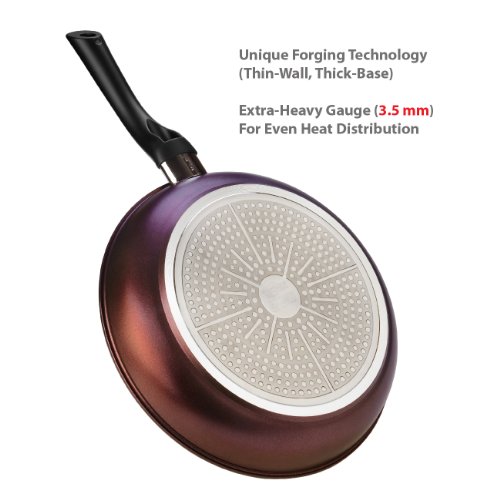 TeChef offers non-stick and durable cookware which makes cooking Healthy Food for a Healthy Family easy, fun and environmentally safe. COATED 5 TIMES with PRINT DESIGN TECHNOLOGY While many other cookware products offered by other manufacturers involve only a 3 layered internal non-stick coating (primer, mid-coat and top-coat), TeChef cookware includes a non-stick coating in 5 layers and is based on Select grade Teflon technology without PFOA. The additional 2 layers of non-stick coating allows the TeChef cookware to be uniquely designed and decorated using Teflon Print Design technology, an innovative and safe method of applying color and prints without the use of harmful external paints. SAFE NEW TEFLON COATING (NO PFOA) The non-stick coatings without PFOA on TeChef products are affirmed safe for cooking by regulatory agencies worldwide, including the European Food Safety Authority, French Food Safety Agency (ANSES), the U.S. Food and Drug Administration (FDA), and the U.S. Environmental Protection Agency (EPA). INDUCTION-READY HEAVY-BASE In contrast to cookware with a uniform thickness, TeChef incorporates a forged aluminum material with thin walls and 3.5 mm thick and heavy bottom. This unique design helps spread the heat evenly across the bottom of the pan and all the way up the sides. The TeChef cookware can be used with all types of ranges, and the unique design makes it compatible with Induction cooktop as well. The world's finest cookware with DuPont Teflon Select / Coated 5 times with DuPont Teflon Print Designs Extra-heavy gauge aluminum construction - No PFOA, No Cadmium, No Lead Pattern on the frying pan helps to cook better and healthier food with just the right amount of oil, every time Soft touch handles for a comfortable grip that makes for convenient handling Aubergine Purple - This colour signals glory and splendour, pure joy of life. Why not transform this lightness of being into a culinary treat for your senses? This warm and inspiring hue invites you to spoil your friends or yourself with symphonies of colour. Shipping Note: Shipping to Alaska, Hawaii, PO Boxes and APO addresses not available for this itemFeature