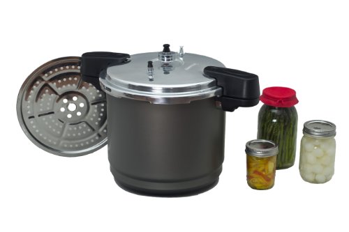 Granite Ware has all the canning products, tools and accessories to do it safely and successfully. The Granite Ware 20-quart Pressure Canner and Pressure Cooker/Steamer is a professional-quality tool, UL-listed, and made of hard anodized aluminum, with stay-cool handles and a locking stainless steel lid. An accompanying rack fits down into the pot to keep jars up off the bottom, and comes with folding handles for easy raising and lowering. The rack holds up to 7 one-quart jars, 8 one-pint jars or 24 half-pint jars. The steamer insert fits into the stepped portion of the vessel about 1/3 the way up from the bottom to hold foods out of the cooking liquid and can handle all your large capacity steaming needs – for tamales, seafood, pulled pork, pot roast, ribs, and more. The pressure canner achieves the high temperature required for safely processing foods with the USDA endorsing it as the only safe method for canning meats, poultry, and low-acid vegetables. It can also be used as a large pressure cooker for any meal that needs to come together quickly. This Granite Ware pressure cooker preserves flavor and nutrients, tenderizes tough cuts of meat, and cooks many foods in one-third to one-tenth the time compared to traditional methods, and is large enough to create family-sized meals with ease. The unit features a pop-up pressure indicator, locking the lid in place. It cannot be opened while the canner is pressurized, even if there is just one psi of pressure. The vent pipe is located in the center of the lid and if it fails or clogs, there is an additional black capped safety valve set to go off and a second all metal safety valve will exhaust residual pressure while sounding a whistling alarm. The sturdy lid locks in place during canning or cooking with the lid gasket sealing ring forming a pressure tight seal between the body of the canner and the cover during use. The Granite Ware pressure canner, steamer, and cooker uses the UL-recommended adjustable 3-piece pressure regulator system. The pressure regulator is calibrated for three different pressure levels at 5 psi, 10 psi and 15 psi, which is ideal for canning at different altitudes. Includes Canning Jar Rack and Steamer Trivet (canning jars are not included).Feature