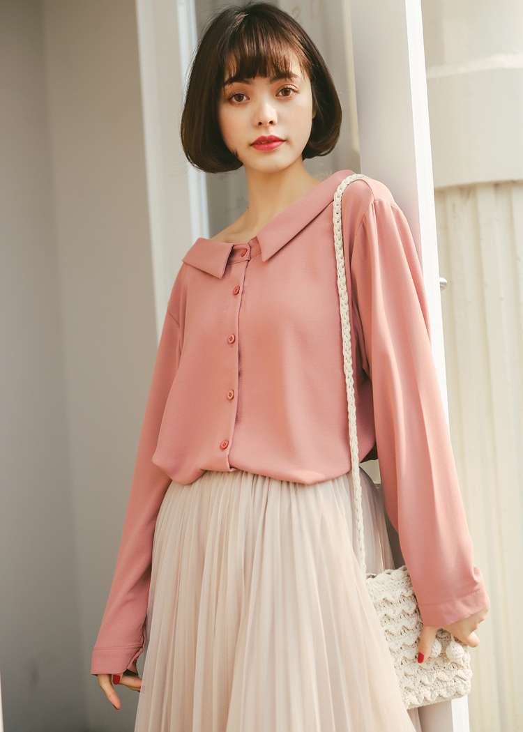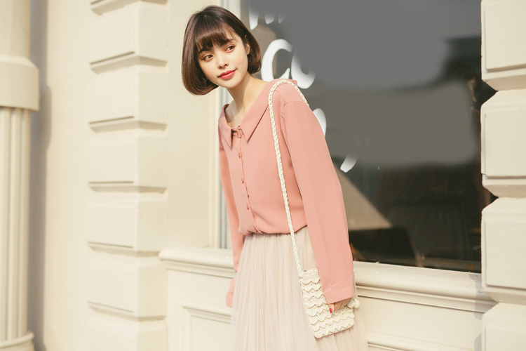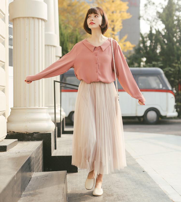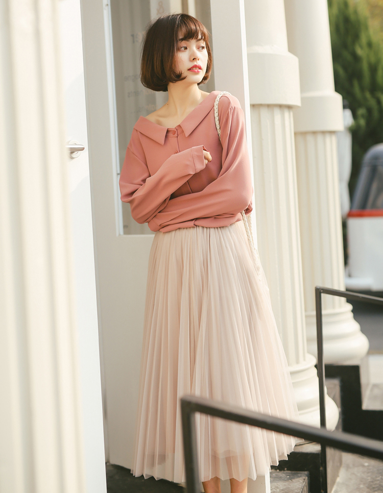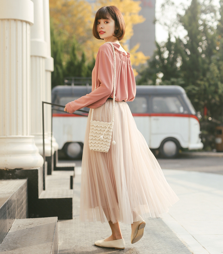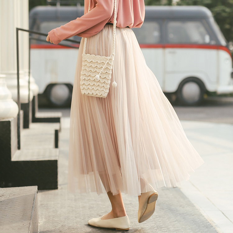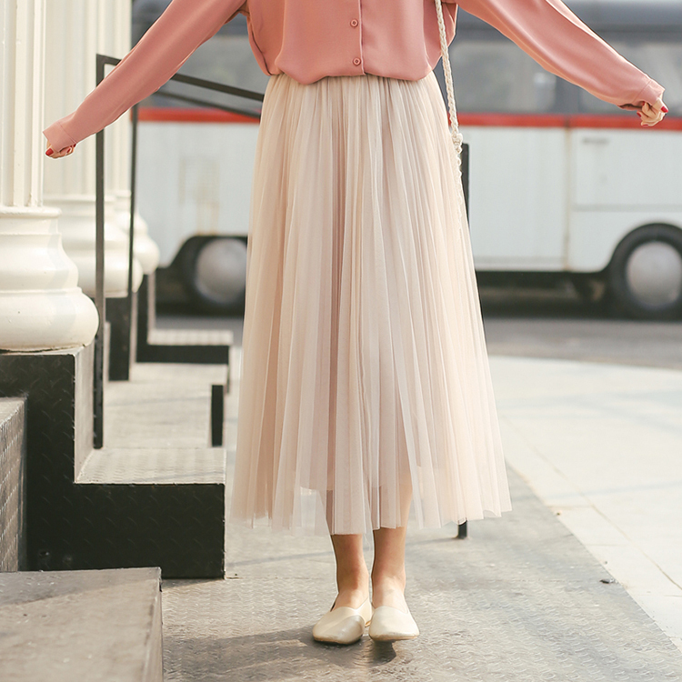 春色カラーが女性らしく、チュールが華やかな印象のロング丈プリーツスカートです。