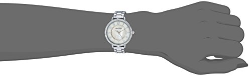 Bezel set with 60 clear swarovski crystals; mineral crystal lens; light tan mother-of-pearl dial with silver-tone hands and easy to read arabic numerals; black printed inner minute track