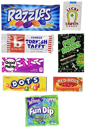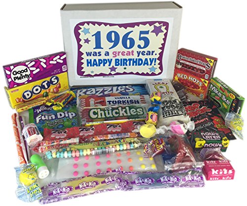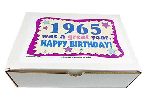 -. Binding : Misc. -. Brand : Woodstock Candy -. Feature : Contains thirty kinds of retro candy that you'll remember from childhood / Makes a fun and unique birthday gift for someone born in 1965 / Box measures 9.5 x 7 x 3 inches and comes shrink wrapped / 1965 birthday gift box comes filled with nostalgic candy that's sure to bring back great memories / Everyone loves candy! -. IsAdultProduct : 0 -. Label : Woodstock Candy -. Manufacturer : Woodstock Candy -. PackageQuantity : 1 -. ProductGroup : Grocery -. ProductTypeName : GROCERY -. Publisher : Woodstock Candy -. Studio : Woodstock Candy -. Title : 52nd Birthday Gift Box of Nostalgic Retro Candy from Childhood for a 52 Year Old Man or Woman Born in 1965 - '60s Jr