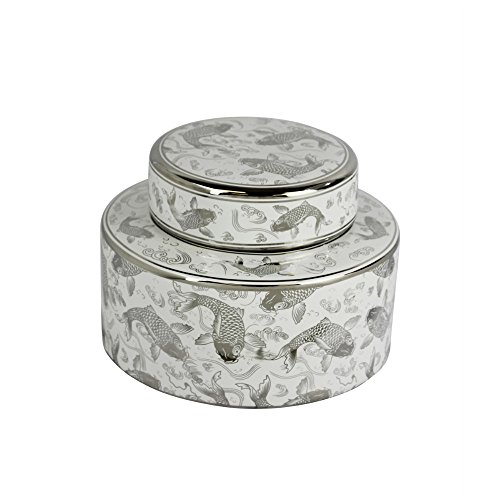 Benzara Ceramic Koi Design Covered Jar, Silver/White